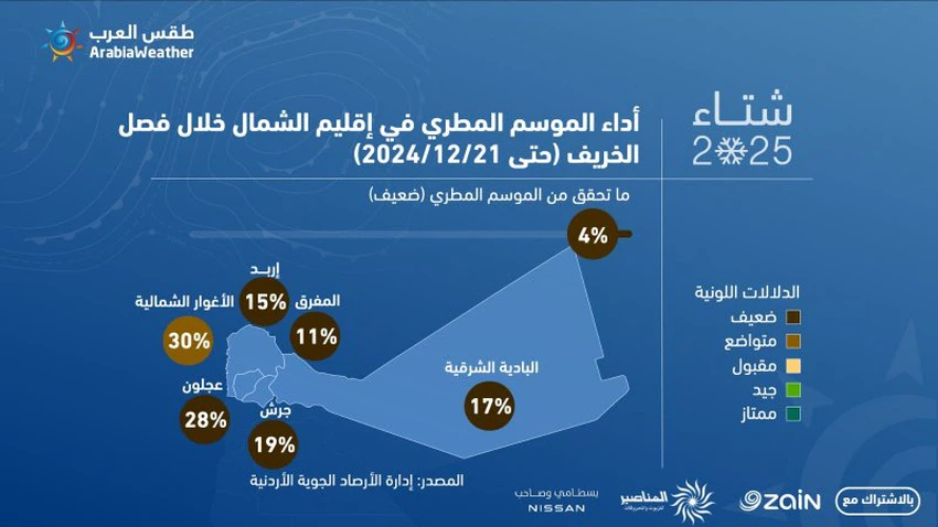 Arab Weather - In a television interview on the Nabd Al-Balad program, the Executive Director of the Arab Weather Center, Muhammad Al-Shaker, confirmed that the rainfall performance to date is the weakest in decades in the Kingdom. For example, the rainfall performance in the capital to date (12/22/2024) has reached less than 10% compared to what is usual, which represents less than 3% of the entire rainy season. This weakness in the rainfall reality has consequences for agriculture and water resources, but Arab Weather is optimistic about improving performance in the coming months, God willing.