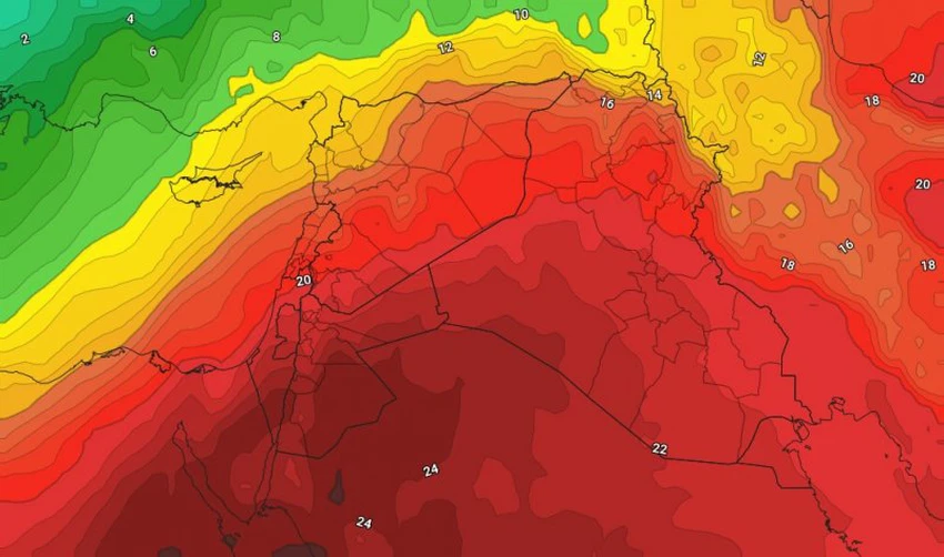 God willing, the low pressure system is expected to move away on Wednesday to center west of Iraq, causing temperatures to drop significantly, but remain 3-5 degrees Celsius above average. The weather will be warm but somewhat dusty, with some medium and high clouds appearing during the afternoon. Winds will be westerly and moderate in speed, with active gusts during the afternoon, and the winds will stir up dust of varying intensity.