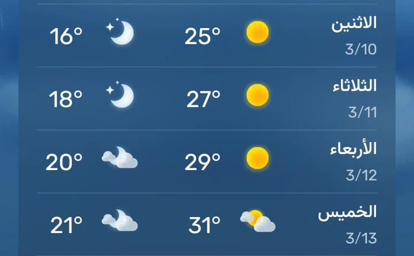 Arab Weather - Weather maps at the Arab Weather Regional Center indicate expectations of moderate to warm weather prevailing in the Jordan Valley, Dead Sea and Aqaba regions during the coming days, coinciding with the Kingdom being affected by a warmer air mass, especially in the middle and end of next week, God willing.