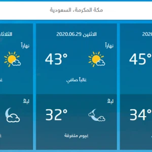 The weather in Mecca remains generally stable during the current week, and the high temperatures rise to peak on Sunday, where it is expected to record 45 degrees Celsius, to decrease gradually on Monday and become in the early seventies degrees Celsius starting from Tuesday.