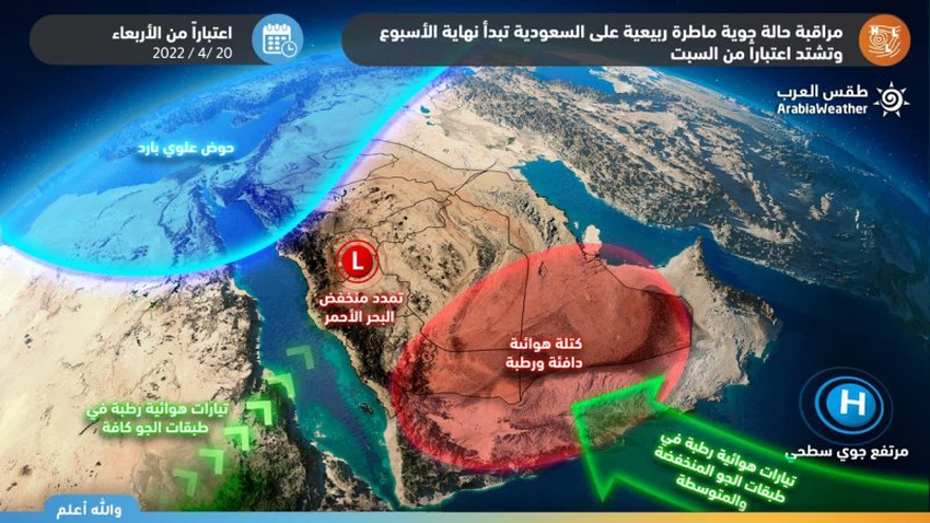 The weather maps, after God’s will, herald an expected spread of rain opportunities on Saturday and Sunday, April 23 and 24, 2022, to extend to large parts of the northern and eastern sectors of the Kingdom, while continuing in the rest of the regions, as a result of the deepening of the cold upper basin of the Kingdom’s atmosphere, to increase the thermal differences between the warm air The proximity of the Earth's surface heated by solar radiation and the cold air above, along with warm and humid air currents blowing from tropical shows. This system works to raise the strength of rain and intensify the intensity of thunder clouds on the mountainous heights and eastern slopes located in the west of the Kingdom, and the extension of rain clouds to include large parts of the Kingdom, and the chances of rain are improving in the capital, Riyadh in particular, starting from Sunday evening, God willing.