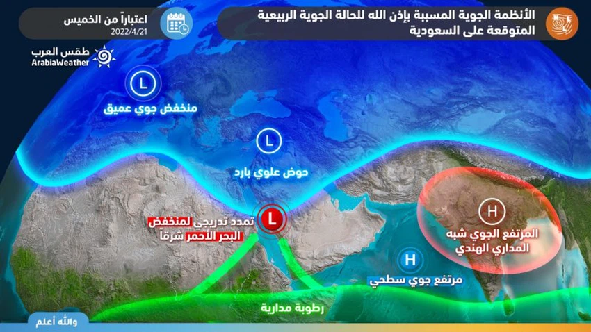 These expected weather disturbances on a regional scale come as a result of a low air rush in the high air layers towards the eastern Mediterranean and northern Egypt, in conjunction with the blowing of warm and humid air currents from tropical shows, which leads to the emergence of unstable weather conditions and a clear surface response to the Red Sea depression. And it is effective in Saudi Arabia in particular, during the coming days, and with the cold upper basin moving towards the east early next week, the rain area spreads/widens and includes large parts of Iraq and Kuwait, and to a lesser extent Bahrain, Qatar and the Jordan Valley. While the impact of the depression is limited to the Sultanate of Oman and the Emirates in the form of local formations on the Hajar Mountains and the eastern mountains of the country, God willing.
