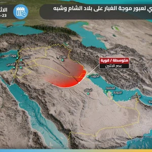 Arab weather - It is expected that dust levels will rise in the atmosphere in several areas of the Arabian Peninsula on Monday and Tuesday 23 and 24 May 2022, and the dust will be of varying intensity between light, medium and sometimes dense, and the effect of dust waves includes 7 Arab countries. This is due to the rush of a less hot air mass from the eastern basin of the Mediterranean, causing temperature differences and a decline in atmospheric pressure values, which will push strong northwesterly winds that create dust waves.