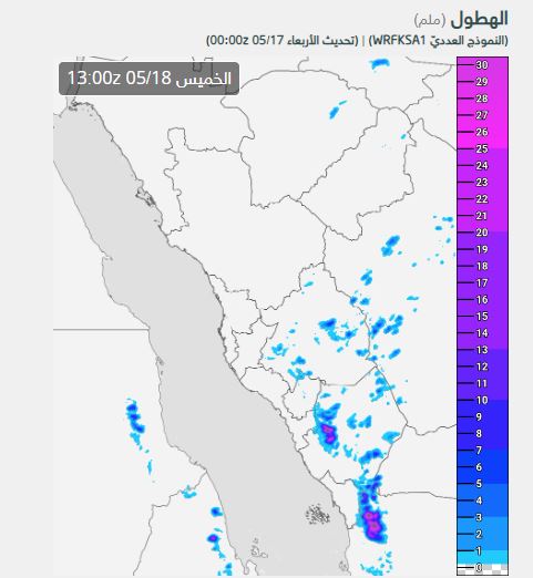 And gradually during the day some cumulus clouds extend to the Riyadh region administratively, including the capital and the eastern region, and are accompanied by medium rains, most of which are sometimes accompanied by the occurrence of thunder. Also, some rain clouds are not excluded for separate parts of the northern borders, Qassim and Hail.