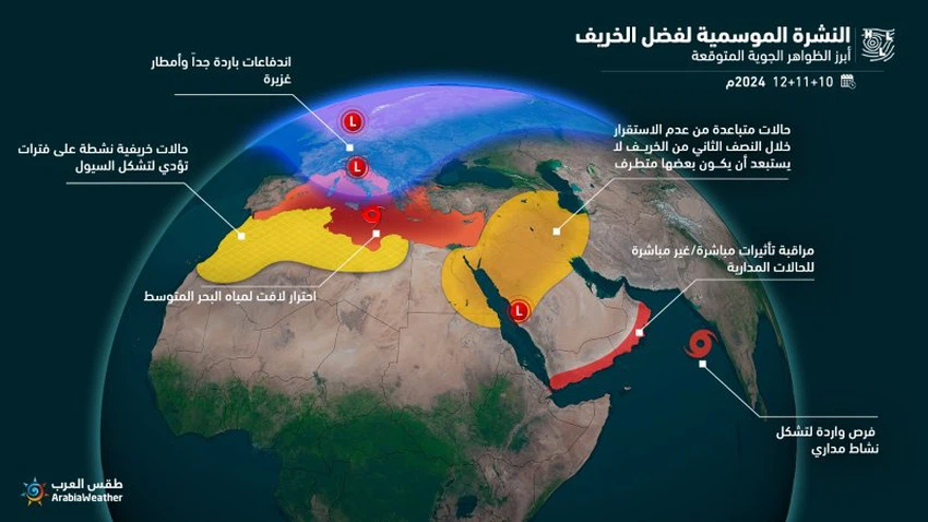 From the Arab Weather Regional Center - The weather forecast cadre issued the climate forecasts for the Kingdom of Saudi Arabia for the next three months (October, November and December) for the year 2024, in a regular monthly update under the name "Seasonal Weather Bulletin", noting that the method of preparing these weather bulletins differs from other daily weather bulletins in that they are devoid of precise details, and their aim is to give a general picture of the season. The aim of presenting the forecasts is also to provide an initial idea of the expected temperatures and rainfall, as well as the most prominent expected climate phenomena.