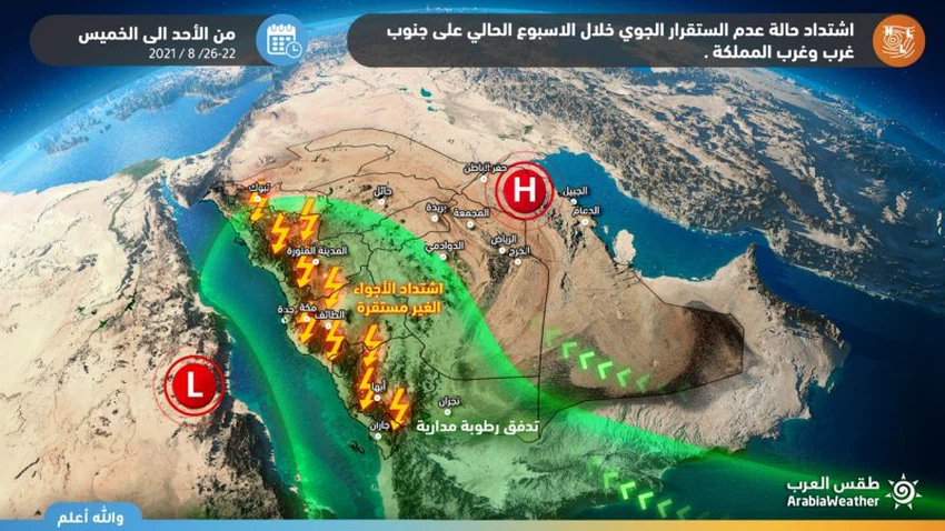 Arab weather - Sinan Khalaf - Weather forecasts for the increase and expansion of weather fluctuations and chances of rain during the coming days in the Kingdom of Saudi Arabia are still fixed, praise be to God, with continued indications of a flow of tropical moisture towards the southwestern and western parts of the Arabian Peninsula during the second half of this week. As a result of the deepening of the Red Sea depression towards the north of the Kingdom of Saudi Arabia.