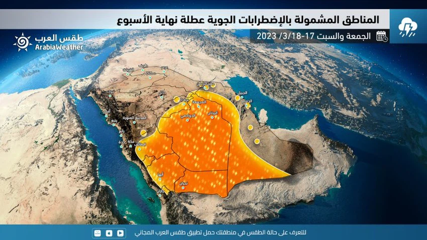 Weather of Arabia - The latest weather readings indicate expectations that several parts of the southwest and center of the Kingdom will be affected on Friday and Saturday 17 and 18 March 2023 by unstable weather conditions associated with thunderstorms in many regions. And the same maps indicate that there is a relatively cold air mass that is expected to rush into the Kingdom during the next week and cause a relative decrease in temperatures, especially at night hours, which makes the atmosphere need to wear warmer clothes again, God willing.