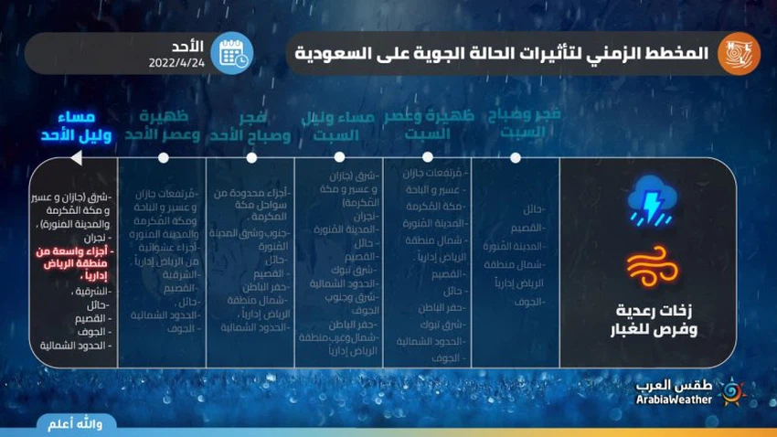 All of this comes within the effects of the most comprehensive rainy state on the Kingdom in the spring of 2022, which comes after a severe case of rain stagnation that the Kingdom witnessed during the past winter, and is considered a rescue for the rainy season. Specialists at the Arab Weather Center have indicated that the effects of the rainy situation will continue in the coming days and extend to the capital, Riyadh, God willing.