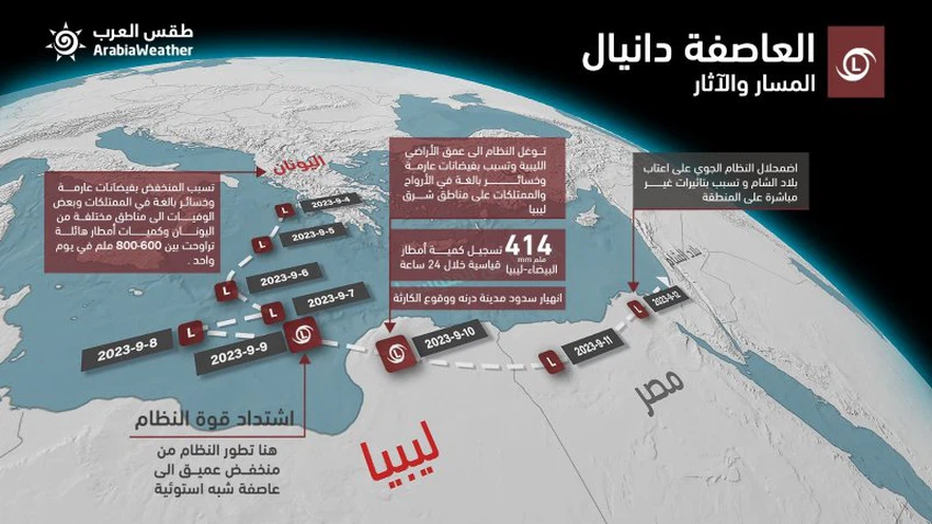Storm Daniel struck the eastern Libyan coast on the morning of Sunday, September 10, 2023, and continued to have an impact on Monday. It was accompanied by stormy wind gusts accompanied by extremely heavy rains, leading to devastating floods that swept entire neighborhoods, killing thousands, and destroying... Many homes, properties, and facilities in several coastal cities in the east of the country, such as Derna, Al-Bayda, Al-Marj, Shahat, and Sousse, in addition to towns and villages in the region.