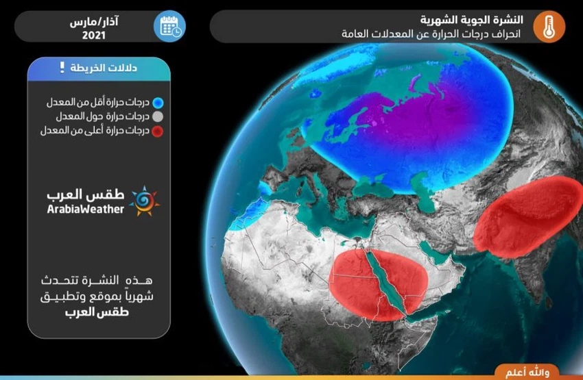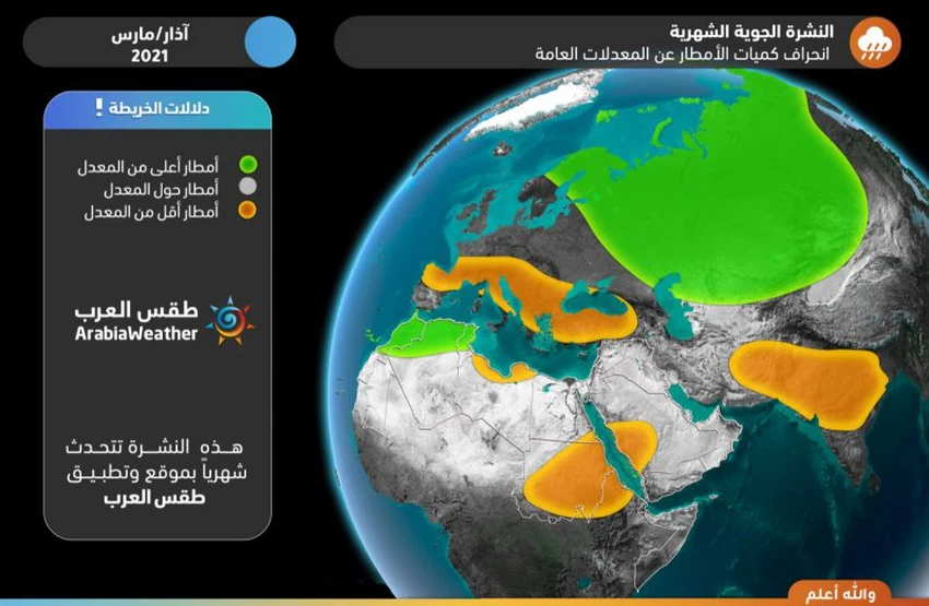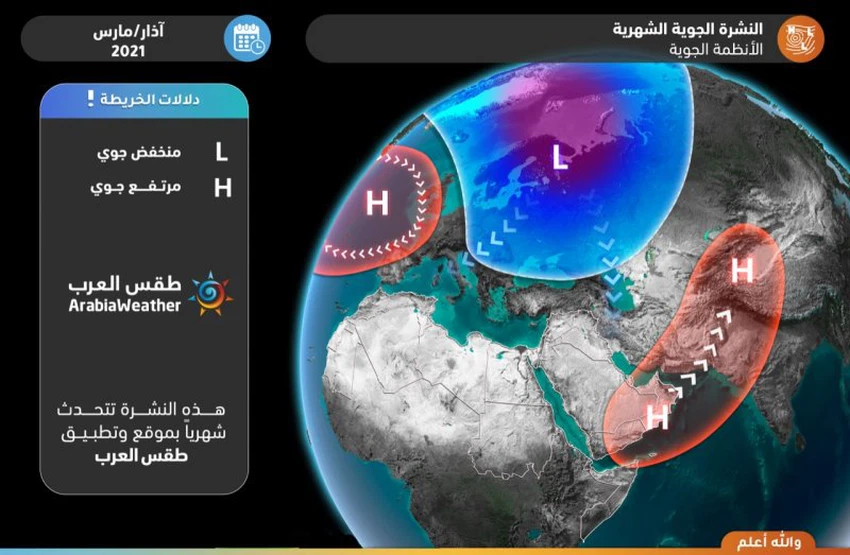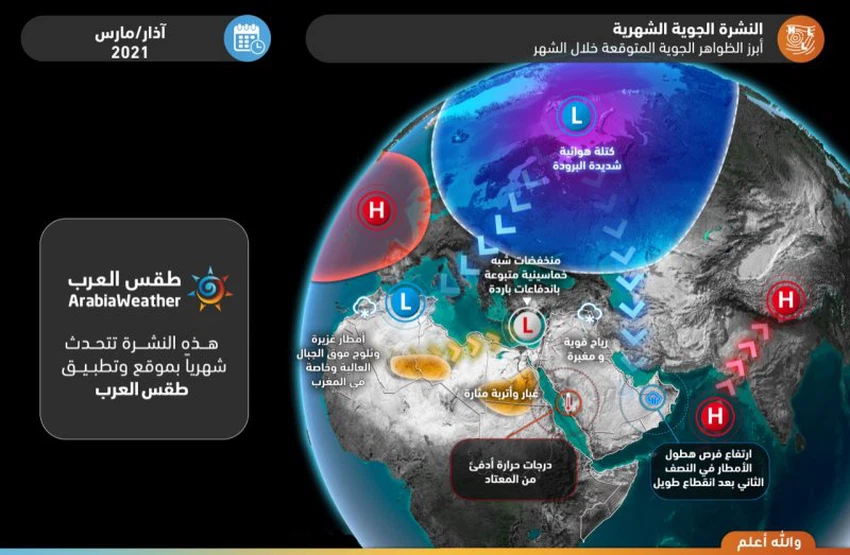 This brings some rain, especially in the northwest and parts of central Saudi Arabia, with an opportunity to extend some rain from the western region for the first time (the best opportunity this month), especially in the east and south of the region, while more stable weather prevails in eastern Saudi Arabia, the Gulf countries, central and southern Iraq. Rains over the Sultanate of Oman and parts of the Emirates.