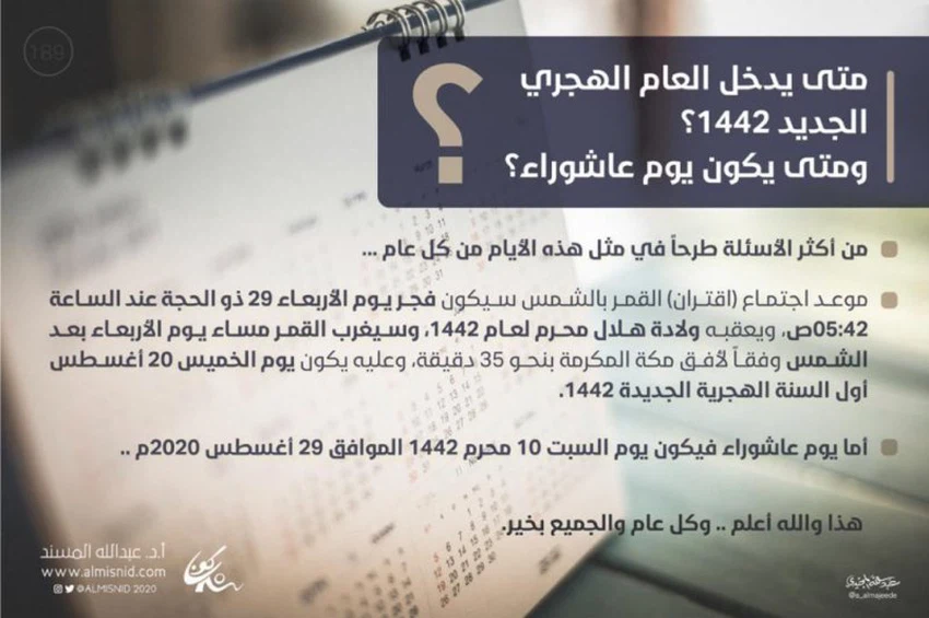 Al-Musnad explained, through his account on "Twitter", that the date of the conjunction of the sun and the moon will be at dawn on Wednesday 29 Dhu al-Hijjah, at 5:42 am), followed by the birth of the crescent of Muharram for the new Hijri year.