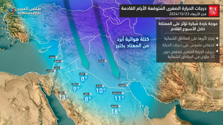 During the last third of October of last year, the Kingdom witnessed its first unusually early rainy season. Heavy rains fell across large parts of the Kingdom, accompanied by hail and strong winds that stirred up dust and sand. Meanwhile, northern regions recorded a significant drop in temperatures, falling to -10°C.