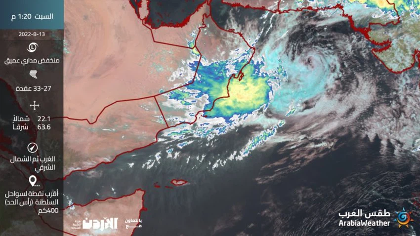 Arab weather - the latest information and data received indicate that the tropical situation, classified as a deep tropical depression, is located to the north of the Arabian Sea, and the surface wind speed around the center is estimated at about 27-33 knots, and is centered at a latitude of 22.1 degrees north and longitude 63.6 degrees east, and is far from the coasts of Sultanate (Ras Al Hadd) about 400 km.