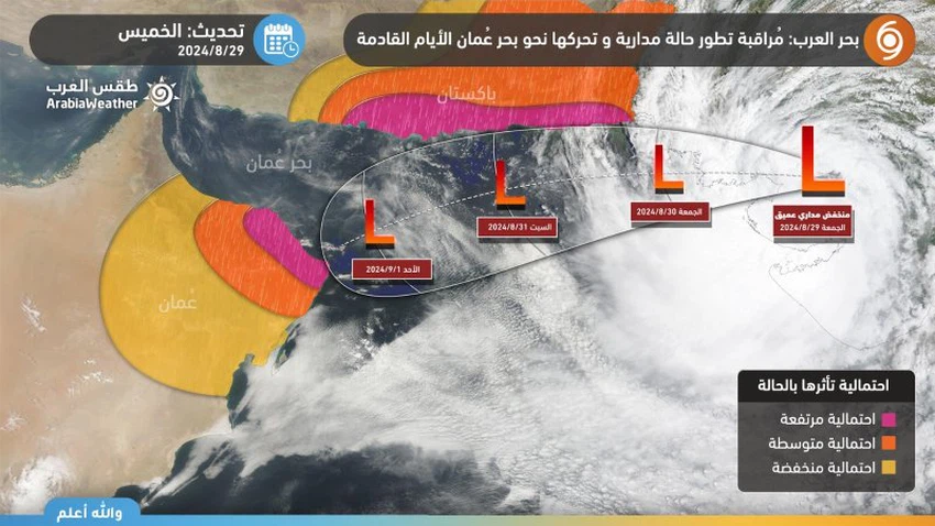 Experts at the Arab Weather Center indicated that the tropical system is expected to be upgraded to a tropical storm named Asna as it moves west towards the northern Arabian Sea during the next 48 hours, and it will continue to move towards the Sea of Oman with the possibility that its effects will reach some governorates of the Sultanate between Sunday and Monday, September 1 and 2, 2024, and it will be accompanied by the flow of clouds at different altitudes interspersed with cumulonimbus clouds leading to thunderstorms of varying intensity.