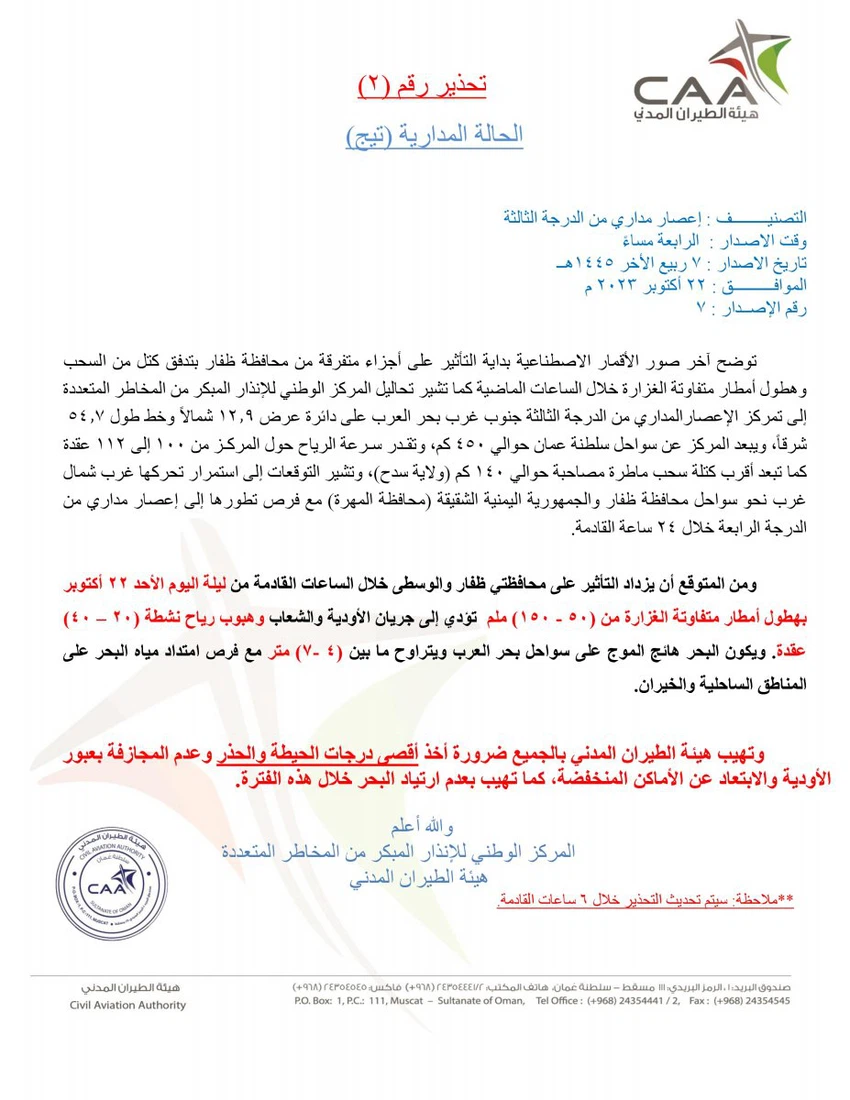 Weather of Arabia - Sinan Khalaf - Omani Meteorology issued a short while ago Warning No. (2) regarding the latest developments and developments in the tropical situation Tej in the Arabian Sea , and the following is the text of the warning: