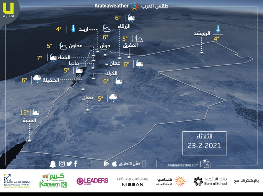 It is expected that the weather will be cold in general, and very cold in the morning in the Badia regions and the mountainous highlands, with the opportunity for rain showers in separate areas, especially in parts of the south and southeast of the Kingdom, which may be accompanied by thunder and hail at times.