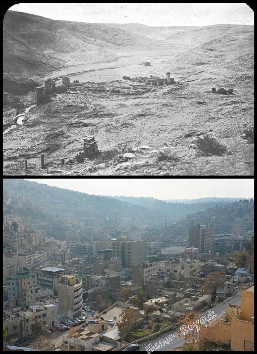 صورة لنفس المكان تقارن ما بين عمان القرن الـ18 و عمان القرن الـ20