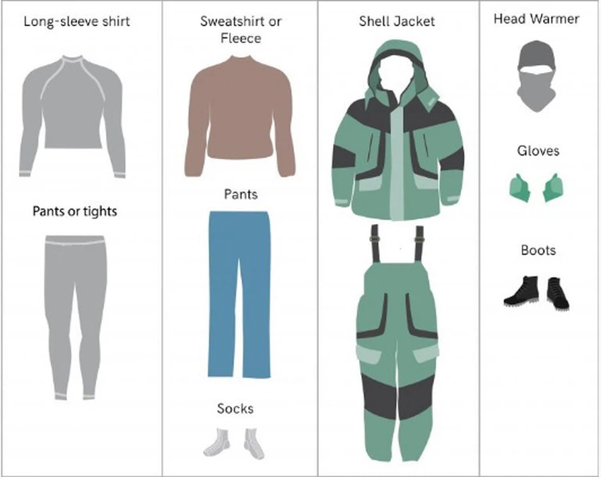 A single piece of thick clothing does not provide as much warmth as several layers of light clothing, and the reason for this is the air trapped between each layer of clothing, as the body radiates heat and heats this air, so each surrounding layer becomes a self-shield that protects you from Cold, but the correct method of wearing layers must be followed for better protection from the cold, which is in the following order: