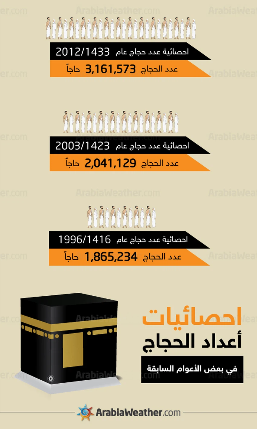 موقع ArabiaWeather.com - في كل موسم حج تقوم مصلحة الإحصاءات العامة والمعلومات بإحصاء عدد الحجاج, سواء القادمين من خارج المملكة العربية السعودية أو المقيمين داخل المملكة.