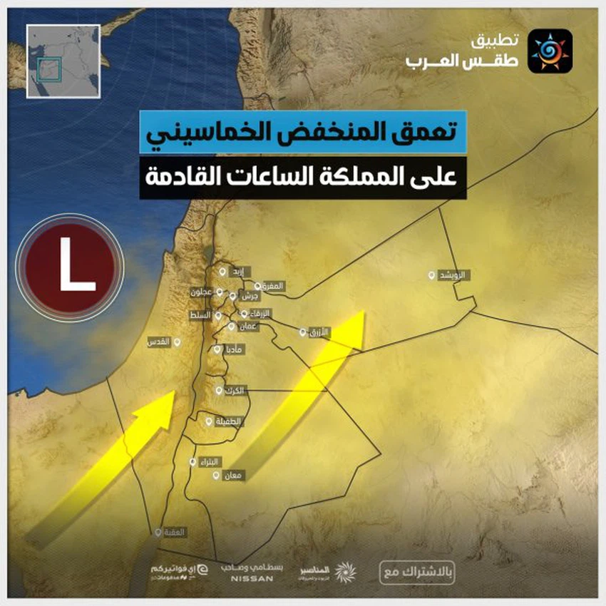 The Kingdom is experiencing Khamasin weather conditions, with hot, dry, and dusty conditions in most parts of the Kingdom, and extremely hot in the Jordan Valley, the Dead Sea, and Aqaba. Large amounts of medium and high clouds are expected.