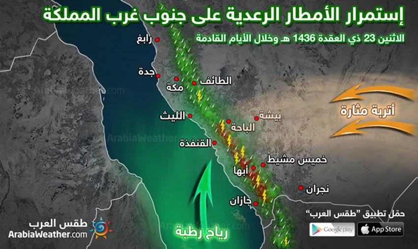 الى ذلك تستمر فرص الامطار الرعدية على المرتفعات في جنوب غرب البلاد حتى منتصف الأسبوع القادم على أقل تقدير، يصاحبها هطول الامطار الرعدية خلال فترة العصر بسبب تكاثر السحب الرعدية الممطرة ويحذر من تشكل السيول في مجاري الاودية خاصة في مرتفعات جازان وأبها وعسير والباحة وصولا الى الطائف. مع امتدادا بشكل أقل الى المشاعر المقدسة على فترات بما فيها مكة المكرمة والمدينة المنورة.