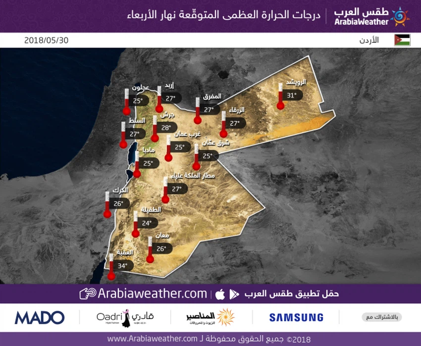 طقس العرب- يُتوقع أن تسود أجواء معتدلة في عموم المناطق، وتبقى الأجواء حارة نسبياً في البحر الميت والاغوار والعقبة.