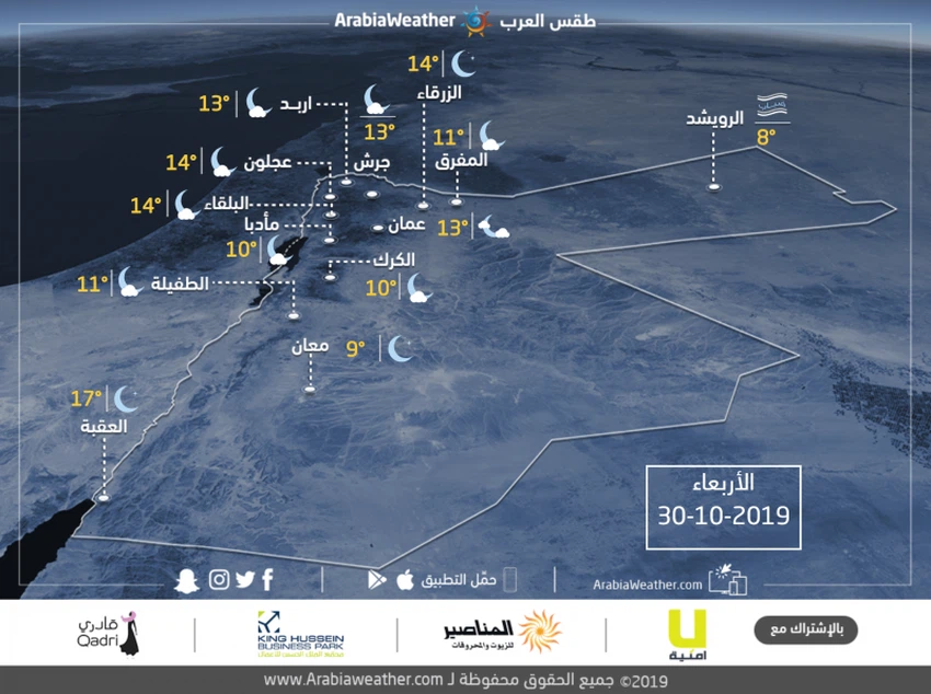 الأردن | حالة الطقس ودرجات الحرارة العظمى والصغرى المتوقعة يوم الأربعاء 30/10/2019