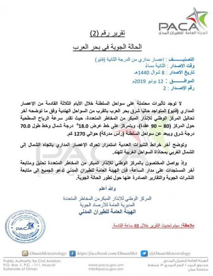 وضمن مثُابعتها المستمرة أصدرت الهيئة العامة للأرصاد الجوية في سلطنة عُمان التقرير رقم 2 حول التأثيرات المُحتملة للاعصار المداري فايو ، وفيما يلي نص التقرير: