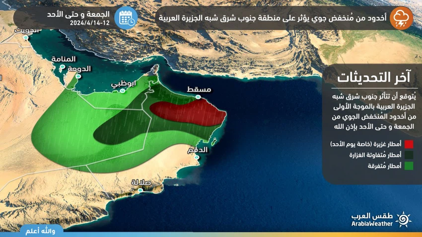 The latest analyzes of the weather forecast team at the Arab Regional Weather Center indicate that the rainy conditions will intensify starting Monday, with cloud strength gradually increasing and rain falling in most areas. This rain will further intensify, becoming heavy at times and accompanied by lightning, thunder, and showers of rain. Hail and active downward winds, covering all regions of the country, including the capital, Abu Dhabi, the coastal strip, and the interior parts, all the way to the city of Al Ain. Arabia Weather will issue more details about the expected weather condition in later reports.