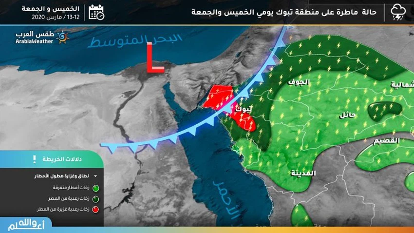 It is expected, God willing, that the air disturbances in the Tabuk region will start gradually starting from midnight on Wednesday / Thursday, and they will be weak in the form of separate showers of rain in random areas, and with the hours of day and Thursday, the chances of rain will increase, God willing, and clouds will become more comprehensive in Tabuk, while Some rain clouds begin to affect the Al-Jouf region, and with evening hours, the rain turns into heavy thunderstorms to very heavy thunderstorms on large parts of the Tabuk region . Thunderstorms also affect both Al-Jouf and the northern borders, but with relatively less intensity.