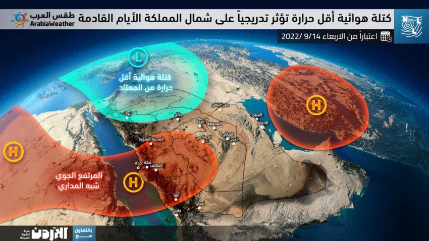 Arab weather - weather maps that simulate the movement of air masses show expectations of a less hot air mass rushing in the northwest of the Kingdom on Tuesday 9-13-2022, so that there is a decrease in temperatures in those areas and the weight of the heat declines, and the depth of the same air mass increases by the end of the week Present.