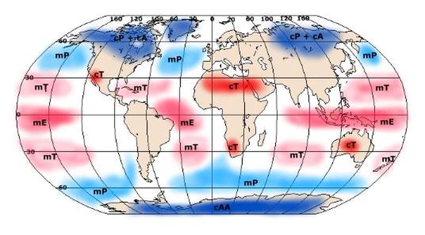 The capital letter describes the air mass temperature: ( E ) for the equatorial, ( T ) for the tropical, ( M ) for the monsoons, ( P ) for the pole, ( A ) for the Arctic or Antarctic, and ( S ) for the superior case - a state Unique with dry air that forms a strong downward motion in the atmosphere.