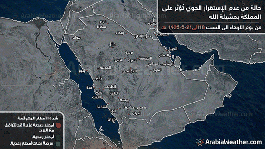 حالة قوية من عدم الاستقرار الجوي خاصة بعد العصر وذلك على حائل والقصيم وشرق المدينة المنورة كذلك على الرياض وشمال شرق السعودية، يحذر من العواصف البردية والامطار الغزيرة ، كذلك من العواصف الرملية المفاجئة التي تنتج من الرياح الهابطة من السحب الرعدية الكثيفة ، وخاصة بعد العصر وساعات المساء والليل الاولى.