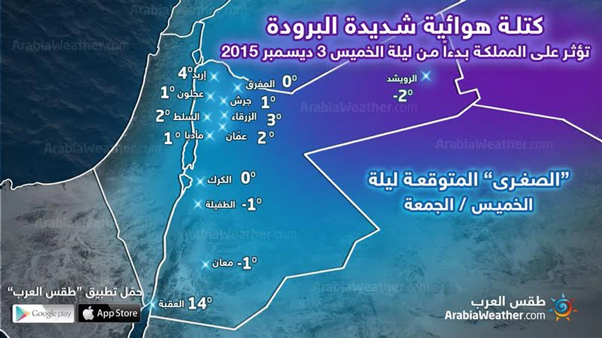 ويتوقع تشكّل الصقيع في السهول الشرقية والعديد من المرتفعات الجبلية وتشمل عمان والمدن الأردنية.