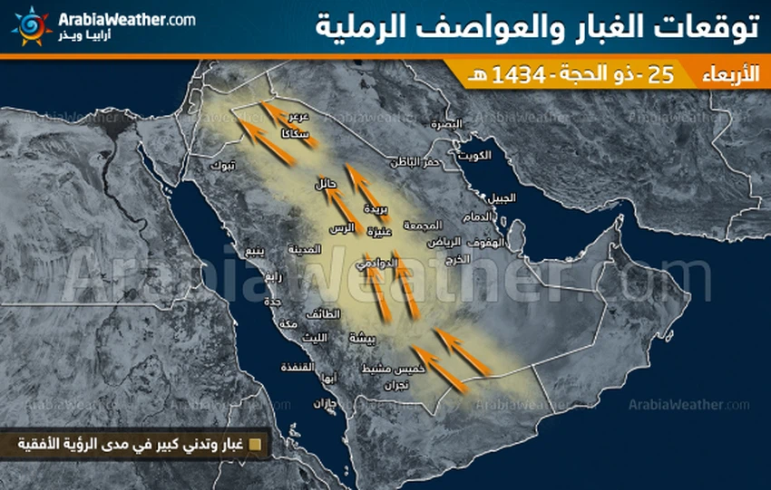 خطر تدني مدى الرؤية الأفقية بشكل كبير خاصة يوم الأربعاء في القصيم و مناطق غرب وسط المملكة و أجزاء من المناطق الشمالية نتيجة للغبار المثار و العواصف الرملية.