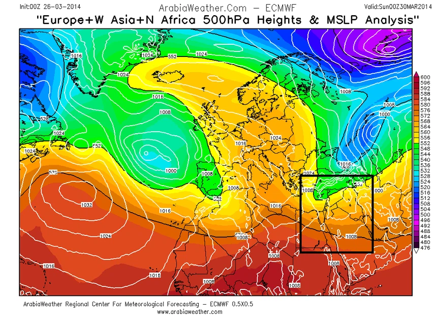 كتلة هوائية شديدة البرودة نحو حوض شرق المتوسط وشمال المملكة( داخل المربع في الخريطة) وذلك نهار الاحد