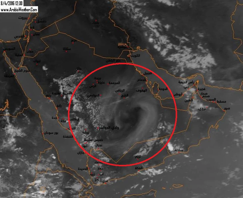 موقع Arabiaweather.com – حسن عبدالله- تظهر صور الأقمار الاصطناعية التي تصل مركز "طقس العرب" الإقليمي مشهدا مثيرا لدوامة ضخمة من الغبار تؤثر على جنوب ووسط السعودية.