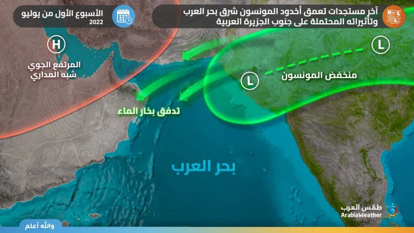 Arab Weather - The latest weather maps received from global centers and others developed from Arab weather internally indicate expectations of the return of rain chances in parts of southern Arabia during the first week of July (starting from the middle of next week), God willing.