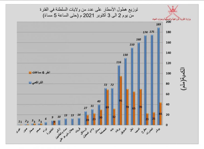 The wilayat of Bawshar topped the list of the wilayats of the Sultanate with the highest rainfall, with 189 mm of precipitation, followed by Al Amerat with 175 mm of precipitation, and Muttrah in third place with 174 mm of precipitation.