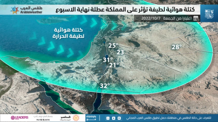 Weather of Arabia - The latest weather maps received from global centers indicate that a nice, hot and humid air mass is expected to rush into the skies of the Levant, including the Kingdom, as of Friday, working to reduce temperatures significantly and clearly to drop by several degrees from their normal rates for this time of the year, After clearly outnumbered over the past few days.