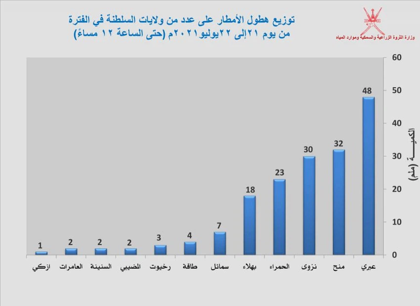Weather of Arabia - Sinan Khalaf - The Ministry of Agricultural and Fisheries Wealth and Water Resources in the Sultanate published the distribution and quantities of rain falling on the Sultanate in Al Fanara from 12 to 22 July 2021 AD.