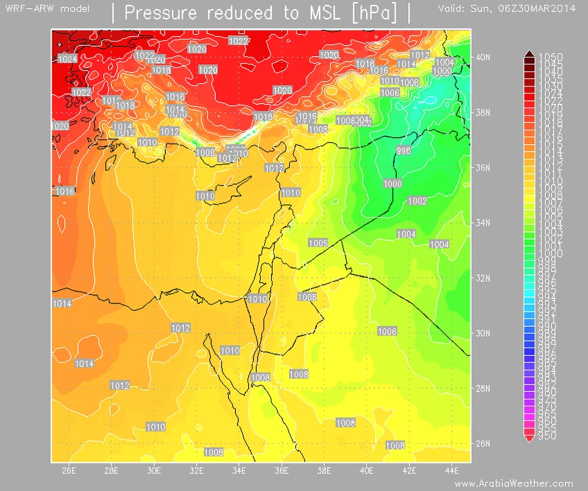 النموذج العددي الخاصة لمركز طقس العرب الاقليمي يرصد المنخفض الجوي فوق شمال العراق وجنوب تركيا.