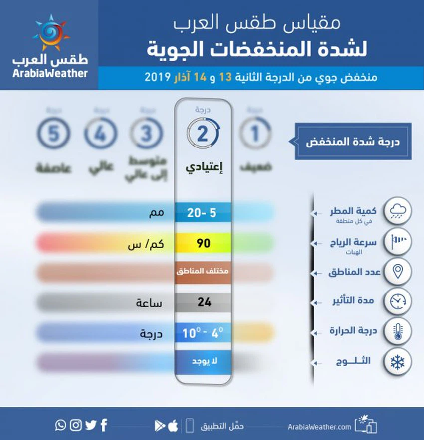 طقس العرب- من المتوقع أن تتأثر المملكة بمنخفض جوي صُنف على أنه من الدرجة الثانية وفقاً لمقياس طقس العرب لتصنيف المنخفضات الجوية، وتالياً كل ما تريد معرفته عن هذا المنخفض الجوي: