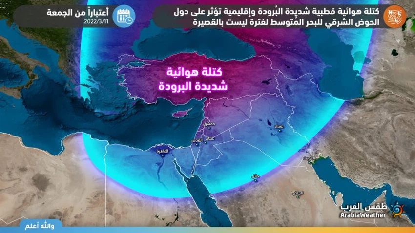 The polar mass that affects the region occupies an area of one million, as this mass covers and affects Turkey, Syria, Jordan, Palestine, Lebanon, Egypt, large parts of northern Saudi Arabia, and Iraqi lands, and the area of this mass is very large.