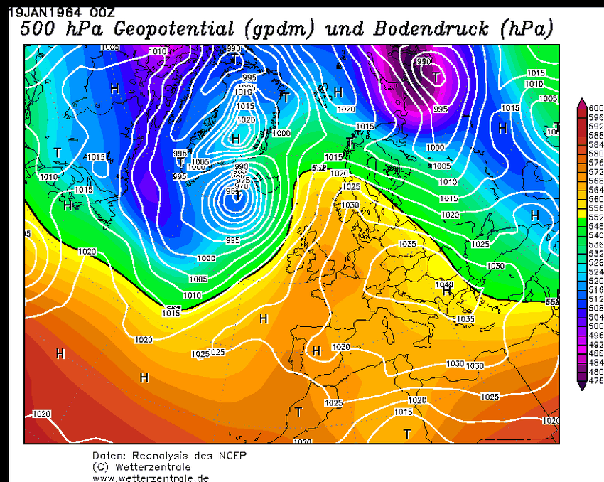 وفي الصورة المُرفقة توضيح للأنظمة الجوية السائدة في 19-1-1964 وفيها تتأثر المملكة بالمُرتفع الجوي الشمال أوروبي والمصحوب بكتلة هوائية قطبية المنشأ وشديدة البرودة، عملت على تدني الصغرى في عمّان إلى ما دون الـ-6 مئوية وفي جبال الشوبك إلى أقل من -15 مئوية.