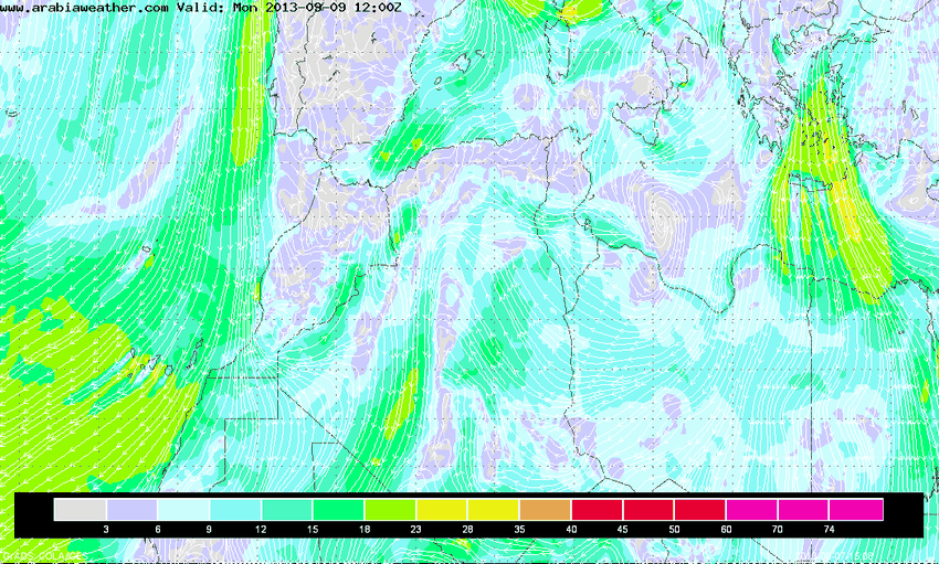 نعود إلى توقعات الإثنين 9-أيلول-2013 الموافق لـ3-11-1434هـ فنجد أن الرياح السطحية في الوطن العربي عموماً ضمن المُعدلات الطبيعية طويلة الأمد، ونجد بعض الأحزمة التي تنشط فيها سرعة الرياح والمُرافقة للإضطرابات الجوية في تلك المناطق، على سبيل المثال تؤدي كُتلة هوائية مُعتدلة الحرارة تدفع برياح سطحية شمالية نشطة على طول السواحل الشمالية الغربية لجمهورية مصر العربية وكذلك تمتد على طول سواحل البحر الأحمر في شرق الجمهورية وصولاً لشمال غرب المملكة العربية السعودية وتُساهم تلك الرياح التي يبلغ مُعدّل سرعتها حوالي 20-40كم/ساعة على إضطراب البحر الأحمر والمتوسط على حد سواء بدرجة ضعيفة إلى متوسطة وبالتالي توجب التحذيرات لحركة القوارب الصغيرة والشراعية كذلك في تلك المناطق.