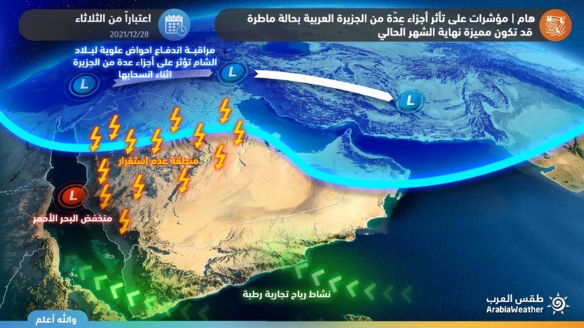 Arab Weather notes, however, that it is not possible to finalize the details of the expected weather situation during the last days of December and the beginning of January, due to the relatively long period and the wide margin of error from now on, and Arab Weather will issue reports and forecasts according to the latest developments.