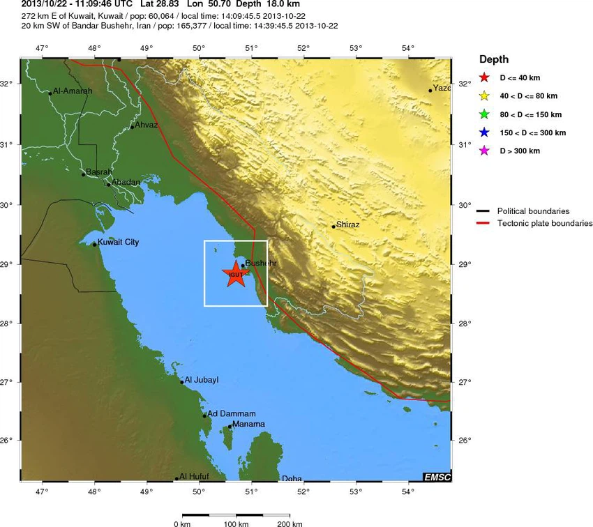 يُذكر أن منطقة بو شهر في إيران بها مُفاعل نووي، و أن المنطقة نشطة زلزالياً.