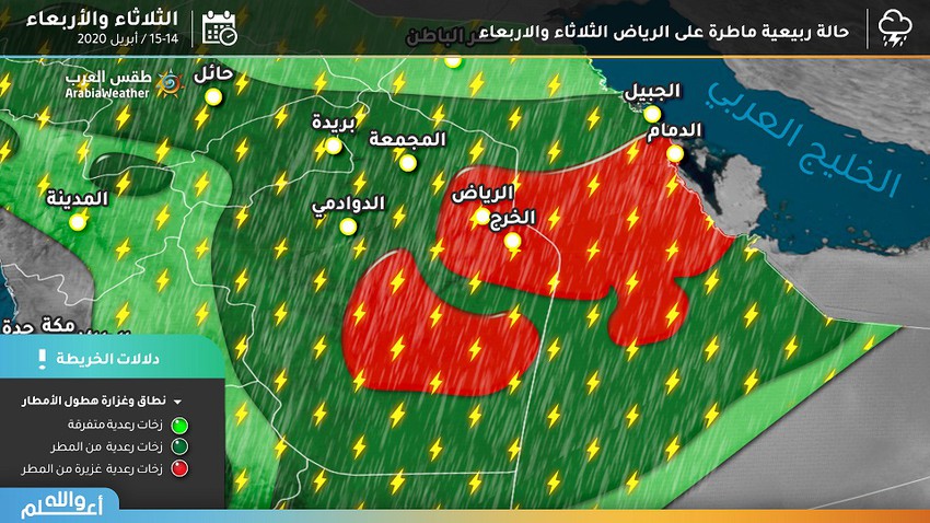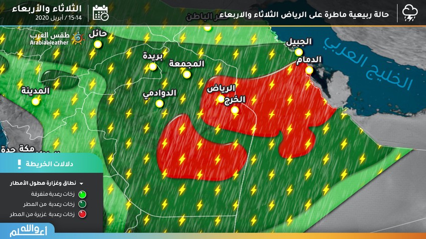 من المُنتظر أن تتأثر مناطق واسعة من المملكة اعتباراً من ساعات مساء الثلاثاء بذروة الأحوال الجوية الماطرة، إذ يُتوقع أن تنشط السُحب الركامية الرعدية في مناطق واسعة من المملكة اعتباراً من ساعات العصر، على تزداد شدة وقوة في ساعات الليل المُتأخرة والفجر في الرياض والشرقية.