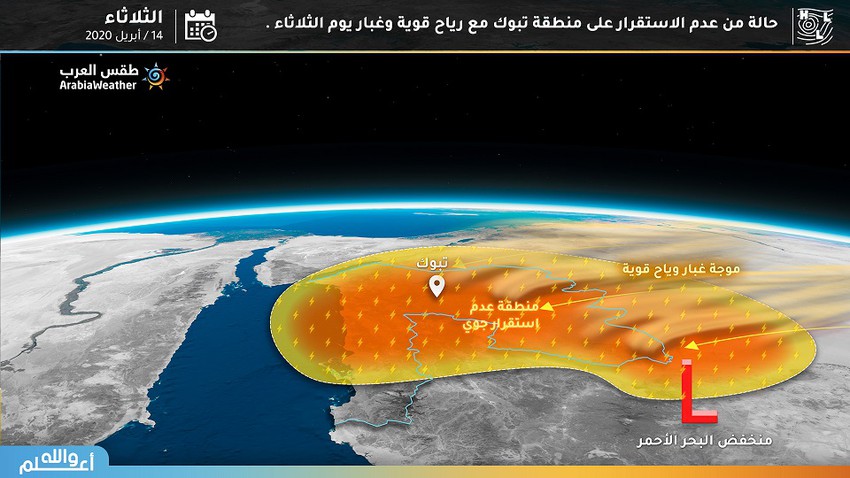 ترصد الأقمار الإصطناعية الخاصة لدى طقس العرب الان اندفاع لموجة غبار كثيفة نحو مدينة تبوك، يُتوقع أن تعمل على تدني وربما انعدام لمدى الرؤية الأفقية، لذا يرجى الحيطة والحذر